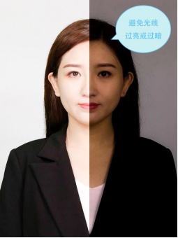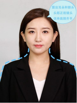 3.露出耳朵和额头,头部正视镜头,保持肩膀齐平,表情自然,嘴唇自然闭合;